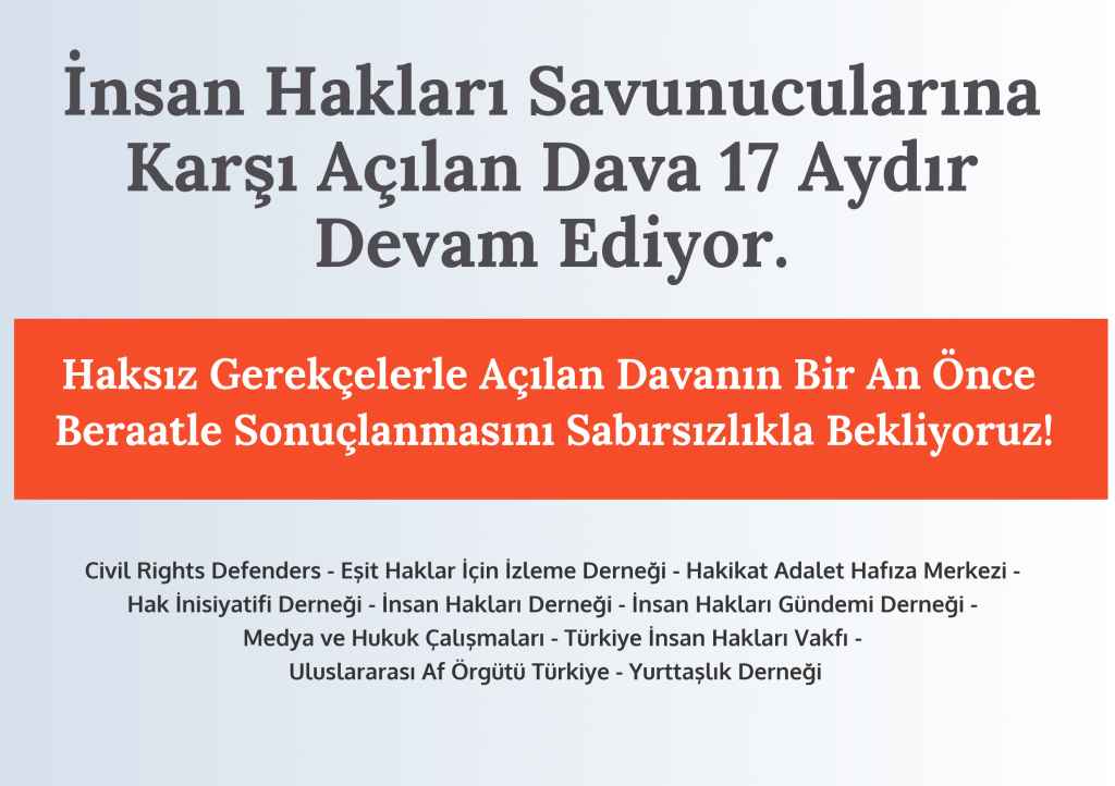 İnsan Hakları Savunucularına Karşı Açılan Dava 17 Aydır Devam Ediyor.  Haksız Gerekçelerle Açılan Davanın Bir An Önce Beraatle Sonuçlanmasını Sabırsızlıkla Bekliyoruz!